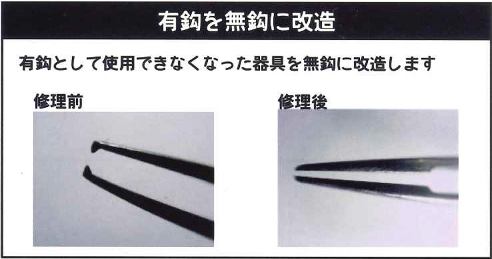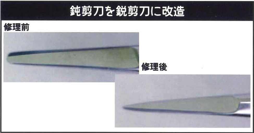 弊社は創業以来お客様の喜ぶ顔を想像しながら、こころを込めて仕事に向き合いご希望の器械や器具を相談し選定し納品する、故障した器械の第一次的な調査をしたあとメーカーの修理部門に引き継ぐ、先端の曲がったセッシ、錆の出た剪刀、嚙み合わせが悪く睫毛が抜けないセッシ、これらの修繕、研磨などをお客様に提供していく、このような仕事をさせていただいております。